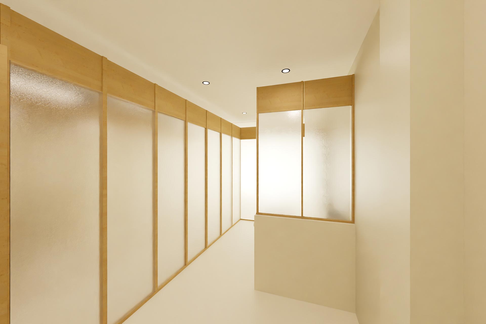 Le volume du bâti d’origine a été intégralement conservé, puis repensé pour répondre aux besoins du programme. À l’intérieur, plusieurs espaces de consultation ont été créés, délimités par des cloisons translucides qui structurent sans cloisonner, laissant filtrer la lumière naturelle et préservant la continuité visuelle du lieu.
